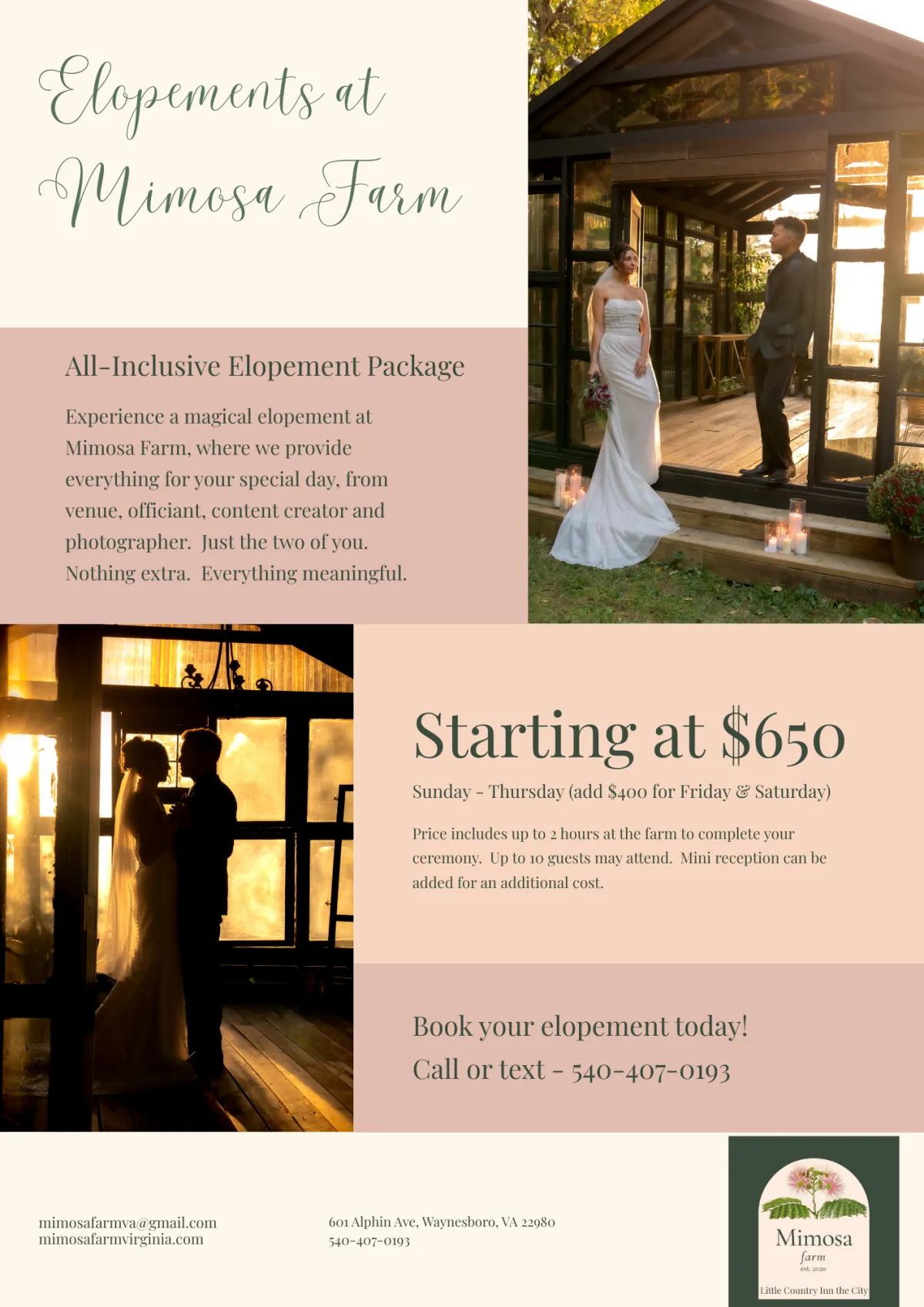 Our all-inclusive elopements start at just $650, making it simple and affordable to create a meaningful, beautiful ceremony at Mimosa Farm.