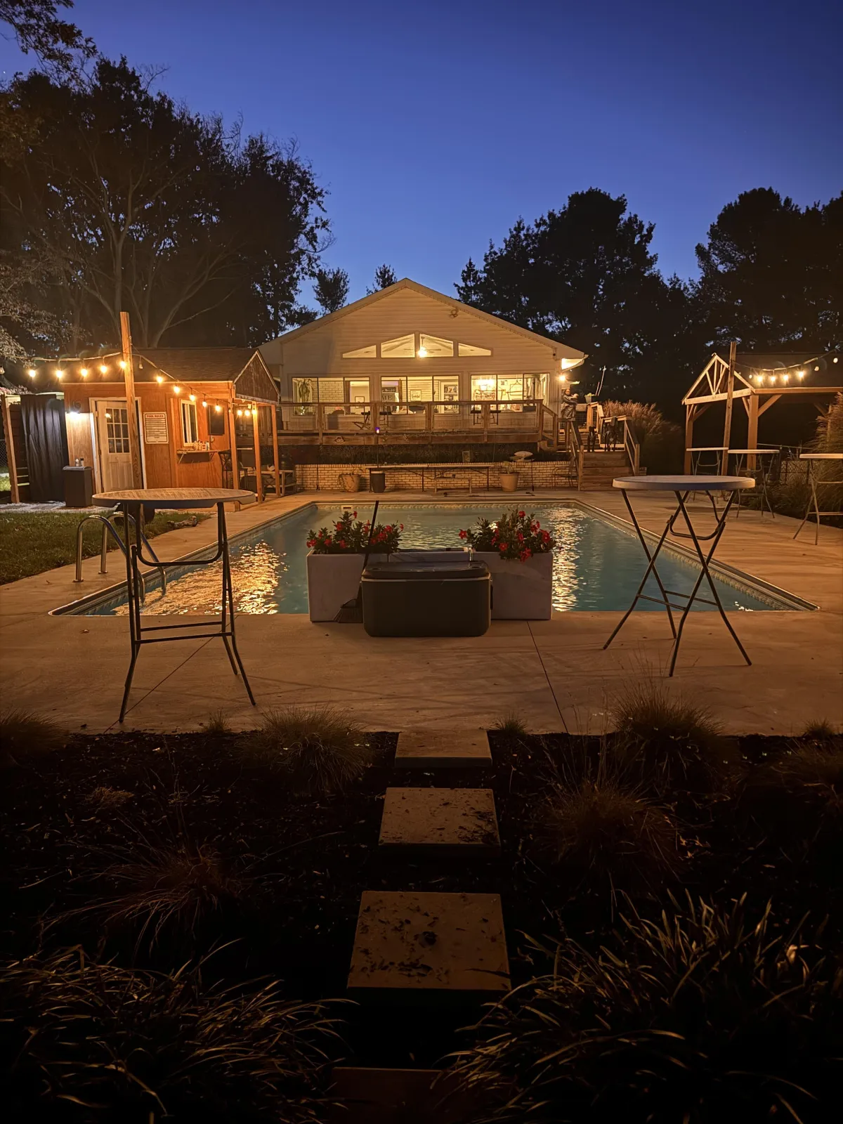Our spacious, fully fenced yard provides plenty of room for guests to mingle and enjoy, while ample parking ensures convenience for everyone. Take advantage of our 20x40 saltwater pool for a refreshing dip or a relaxing poolside gathering. For your comfort and ease, we offer a clean, outdoor portable restroom and a fully equipped outdoor kitchen—ideal for preparing and serving delicious meals during your event.